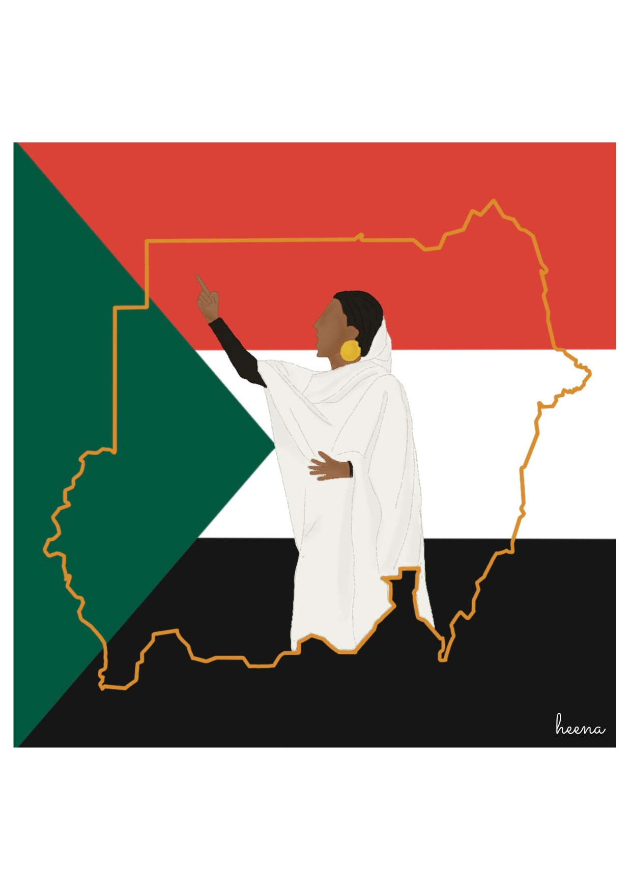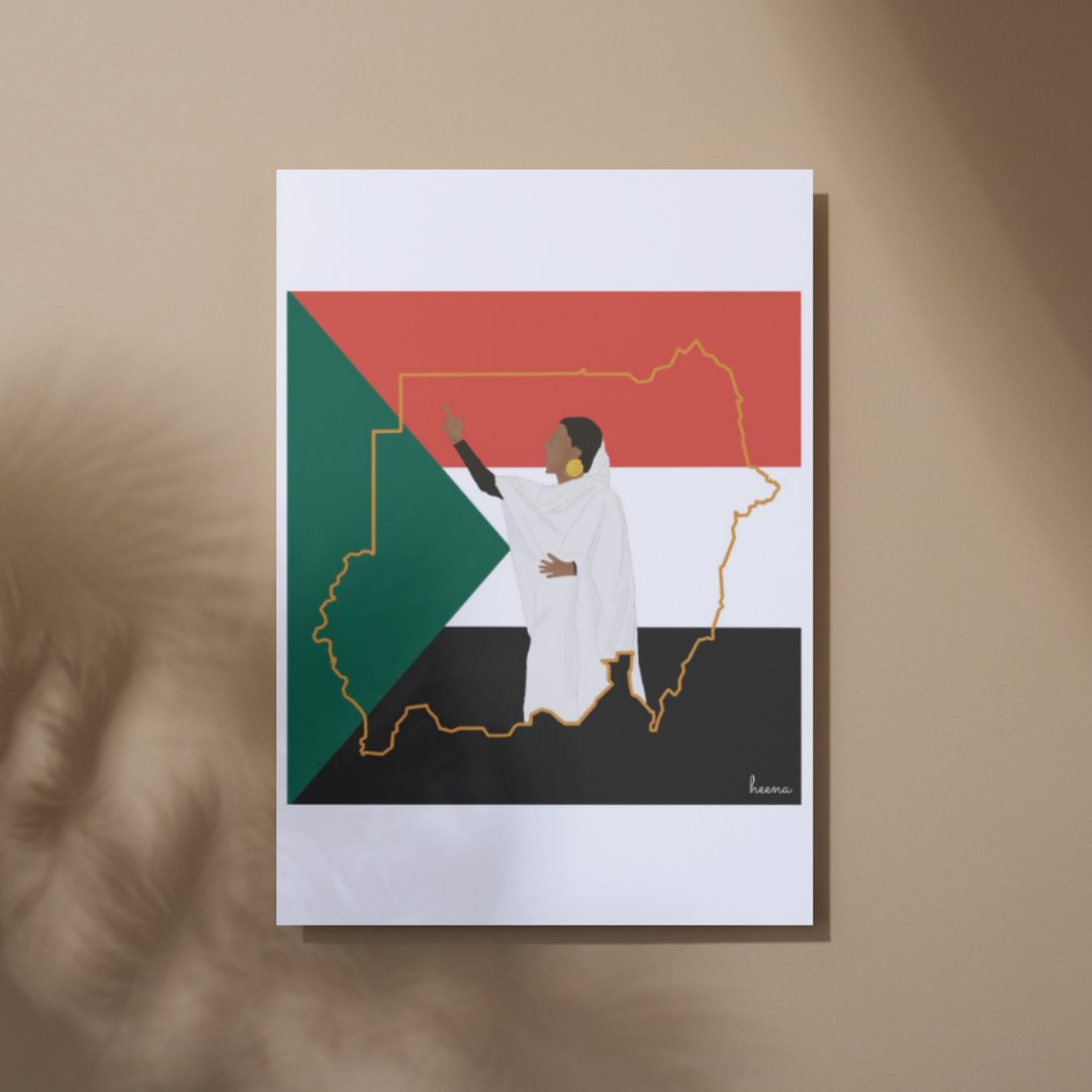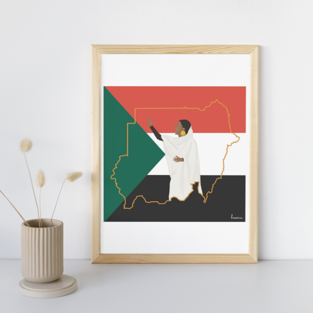 Featuring a vivid illustration of the Sudanese flag and map, this artwork is brought to life with the iconic image of activist Alaa Salah. Known for her inspiring role in the Sudanese revolution, Alaa Salah stands as a symbol of resilience and determination.