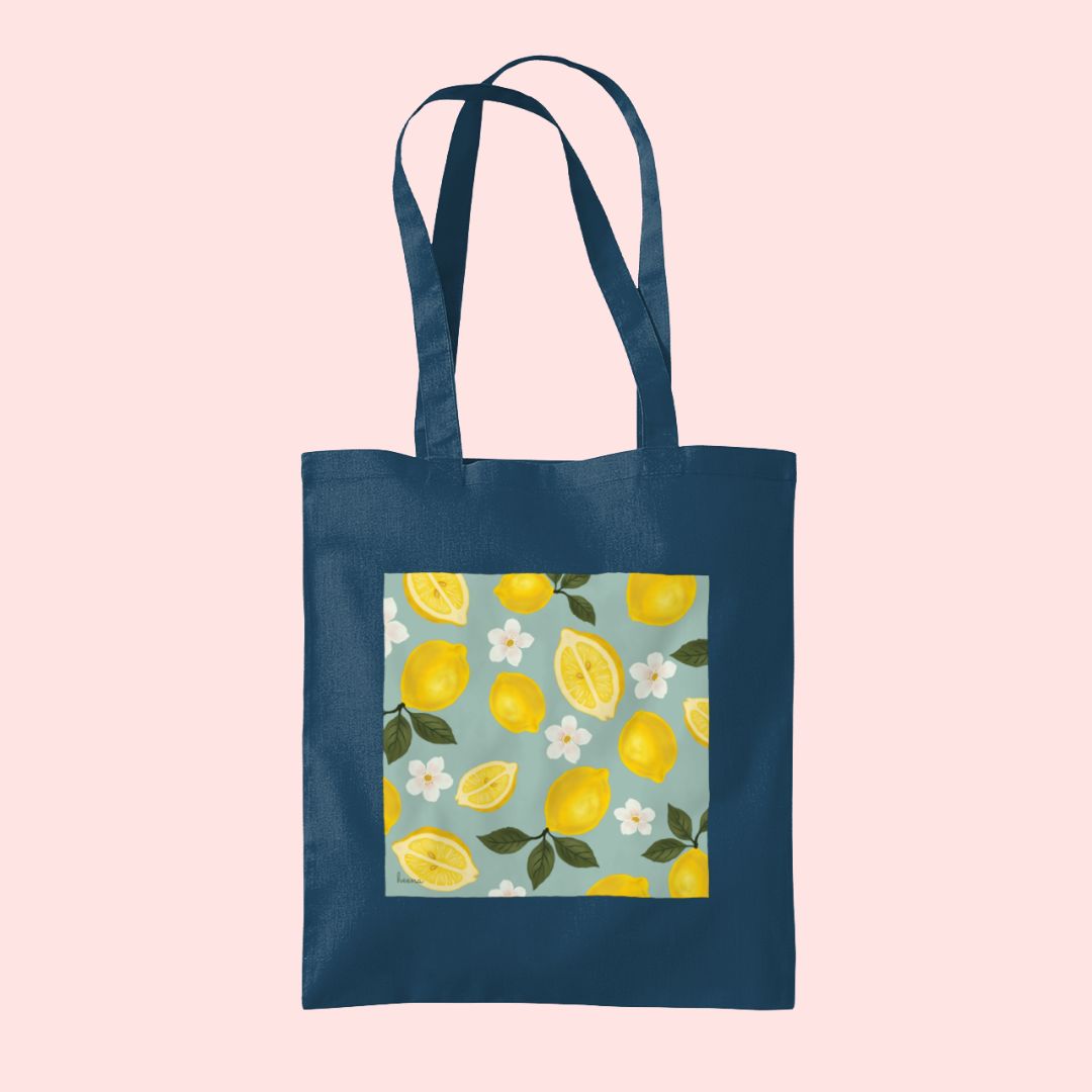 Introducing our ‘Lemons’ tote bag from the Flowers and Fruit Collection. This citrus illustrated tote pays homage to the Amalfi Aesthetic. Centering yellows, creams and greens on top of a petrol blue tote bag. Marvel at the beauty of nature through the different stages of the lemon – from flower, to full fruit and then sliced.