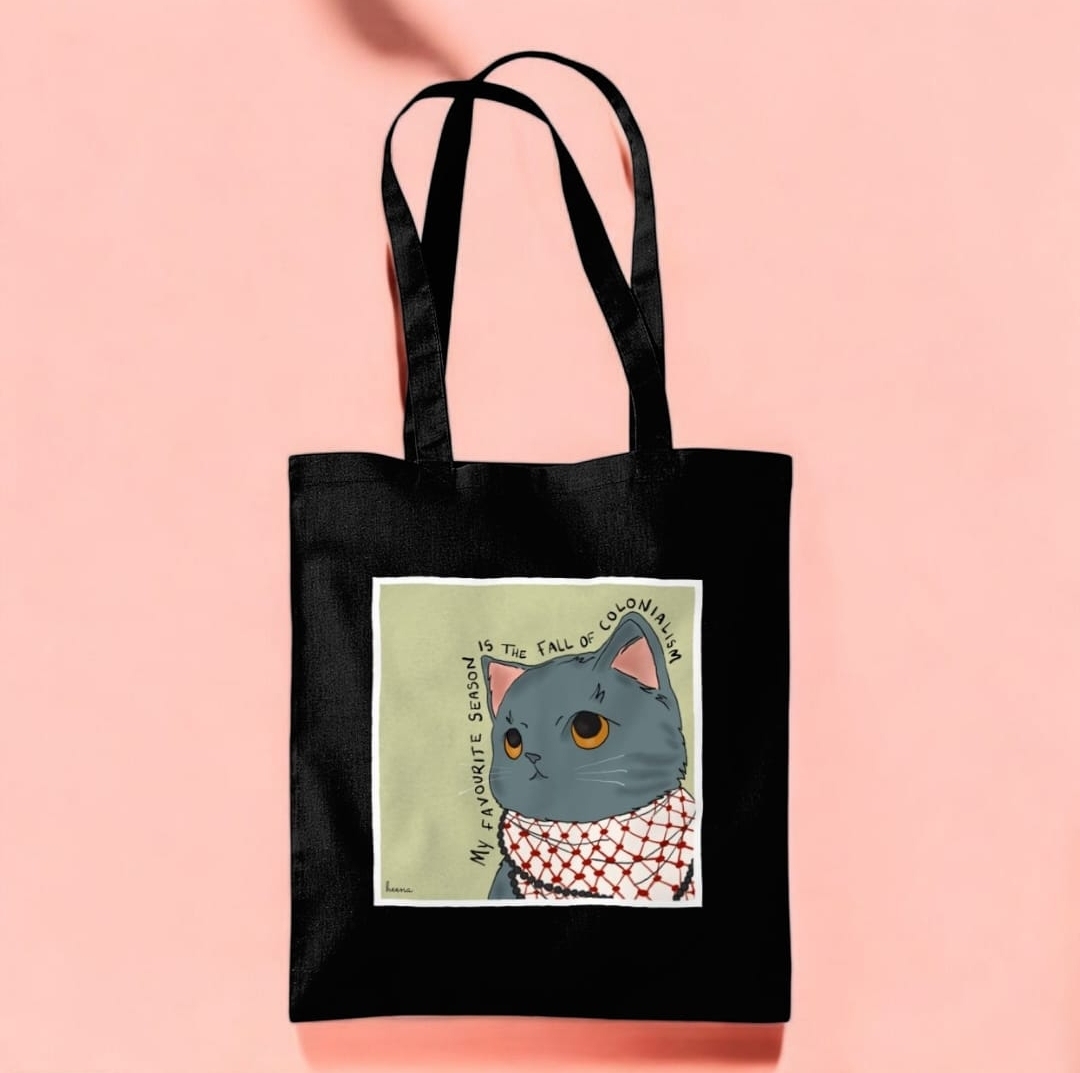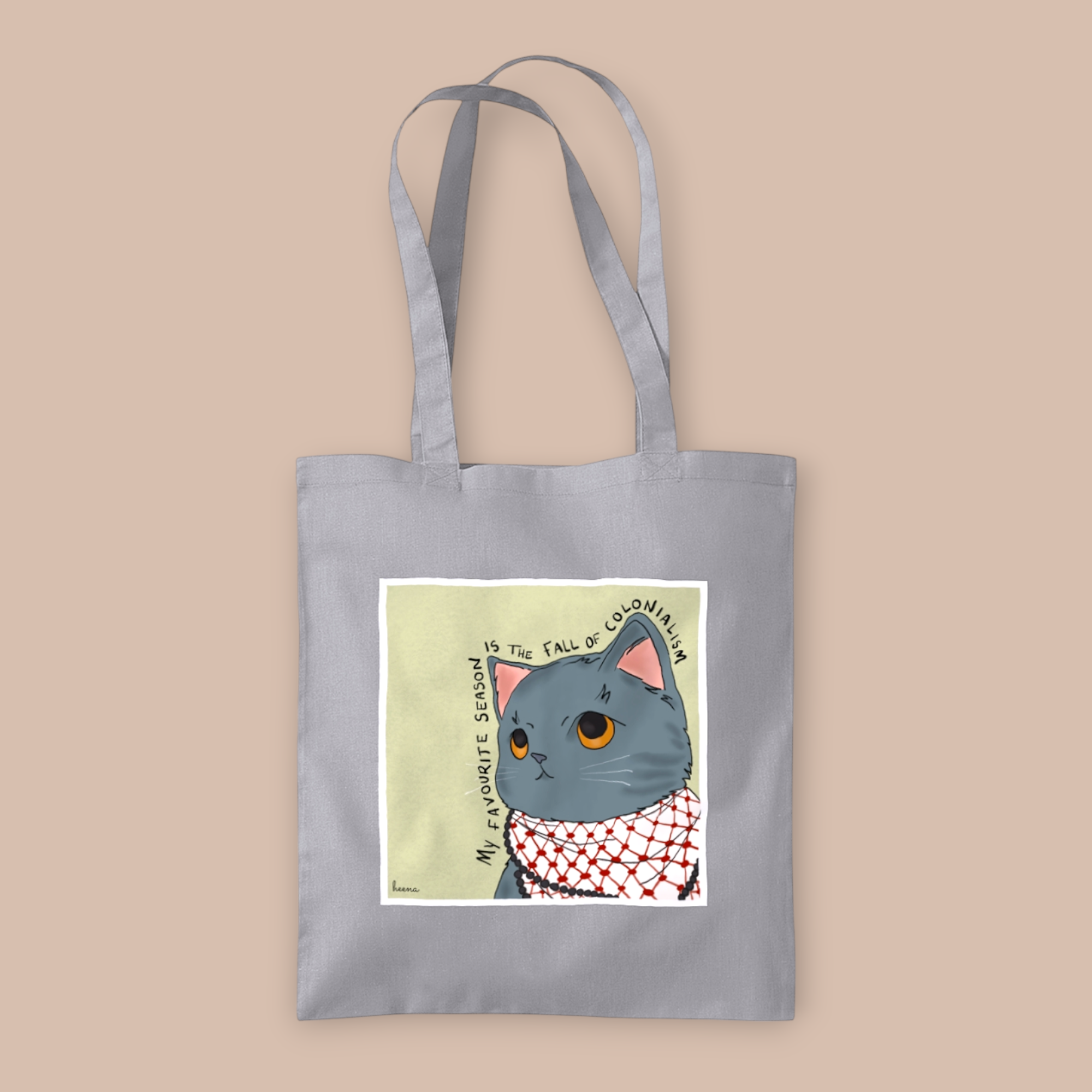 Show your support in bringing down colonialism with the help of cats! This quirky tote bag has an illustration of a British-short haired Blue cat wearing a red kuffiya. Surrounded with a thought-provoking slogan: “My favourite season is the fall of colonialism’.