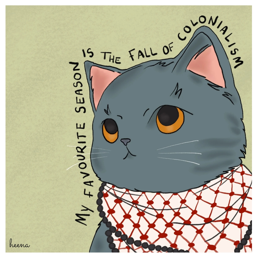 Introducing our ‘Cats and Colonialism’ illustrated tote bag, where your love of cats meets your pride in activism. Featuring an image of a British-short haired Blue wearing a red kuffiya against a green backdrop with the powerful message of “My favourite season is the fall of Colonialism’.